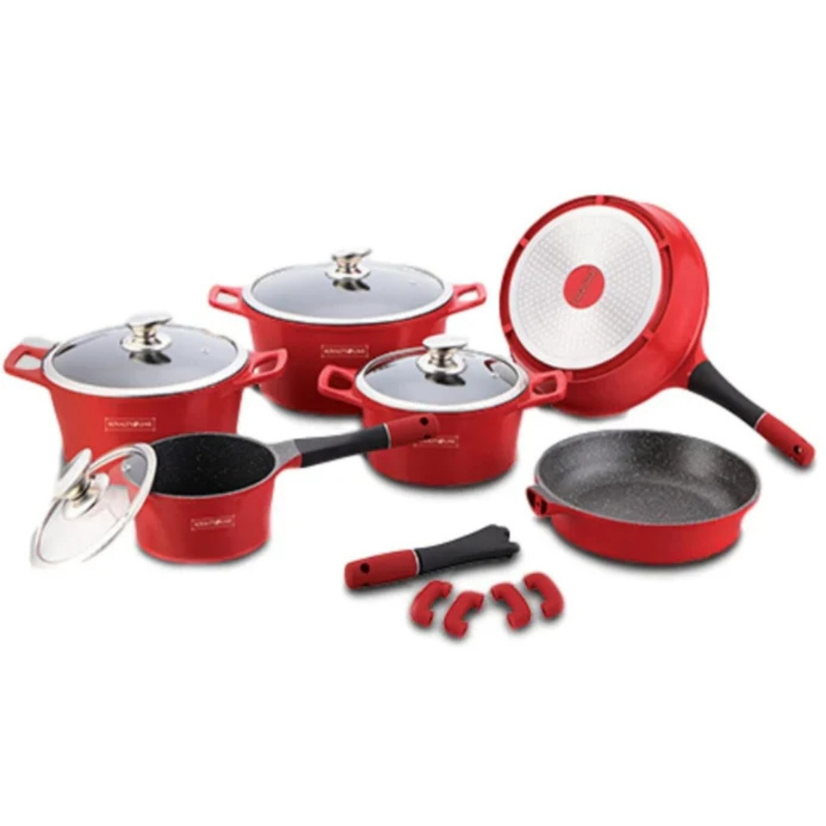 Completeaza-ti bucataria cu setul de cratite marmorate Royalty Line, 14 piese, ideal pentru prepararea unor mese sanatoase si delicioase. Fabricate din aluminiu turnat si acoperite cu invelis de marmura antiaderent, aceste vase asigura o distributie uniforma a caldurii si previn lipirea alimentelor.